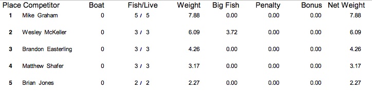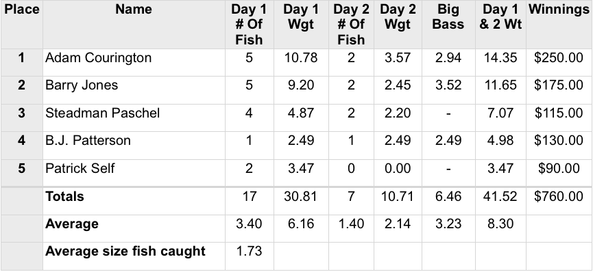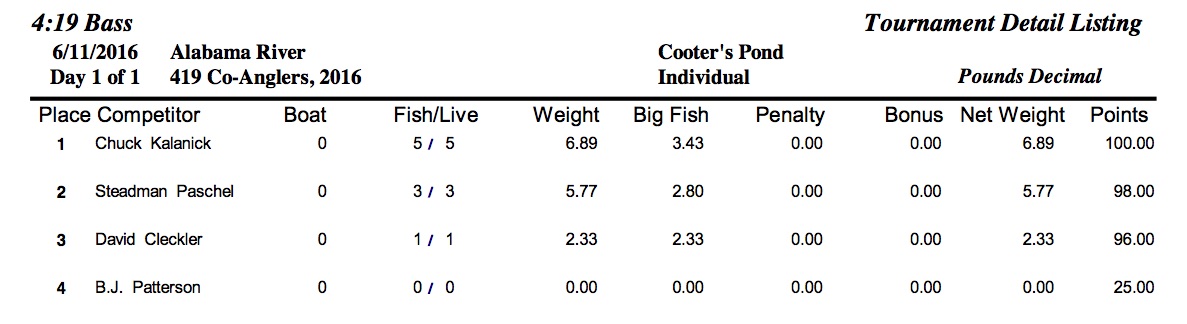 6/11/16 Alabama River Cooter's Pond Safe Daylight Boaters Results Co-Anglers Results
