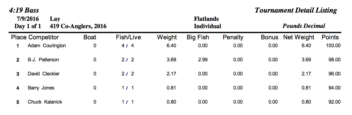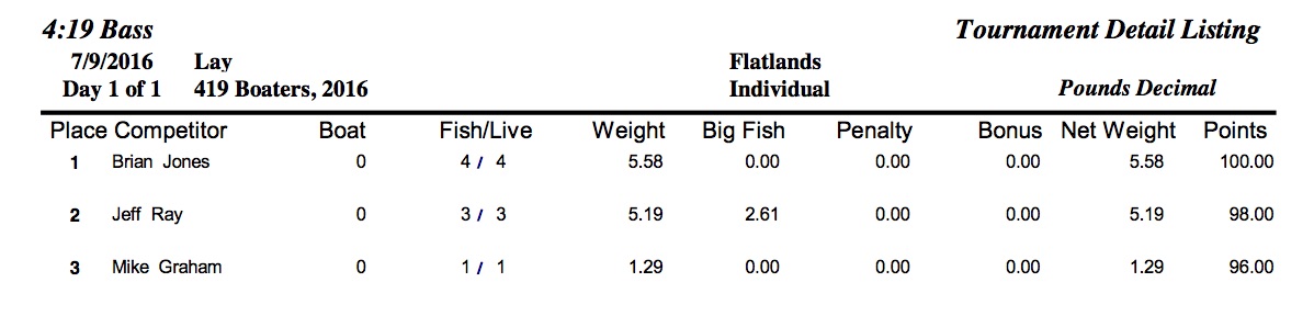 7/9/16 Lay Flatlands Safe Daylight Boaters Results Co-Anglers Results