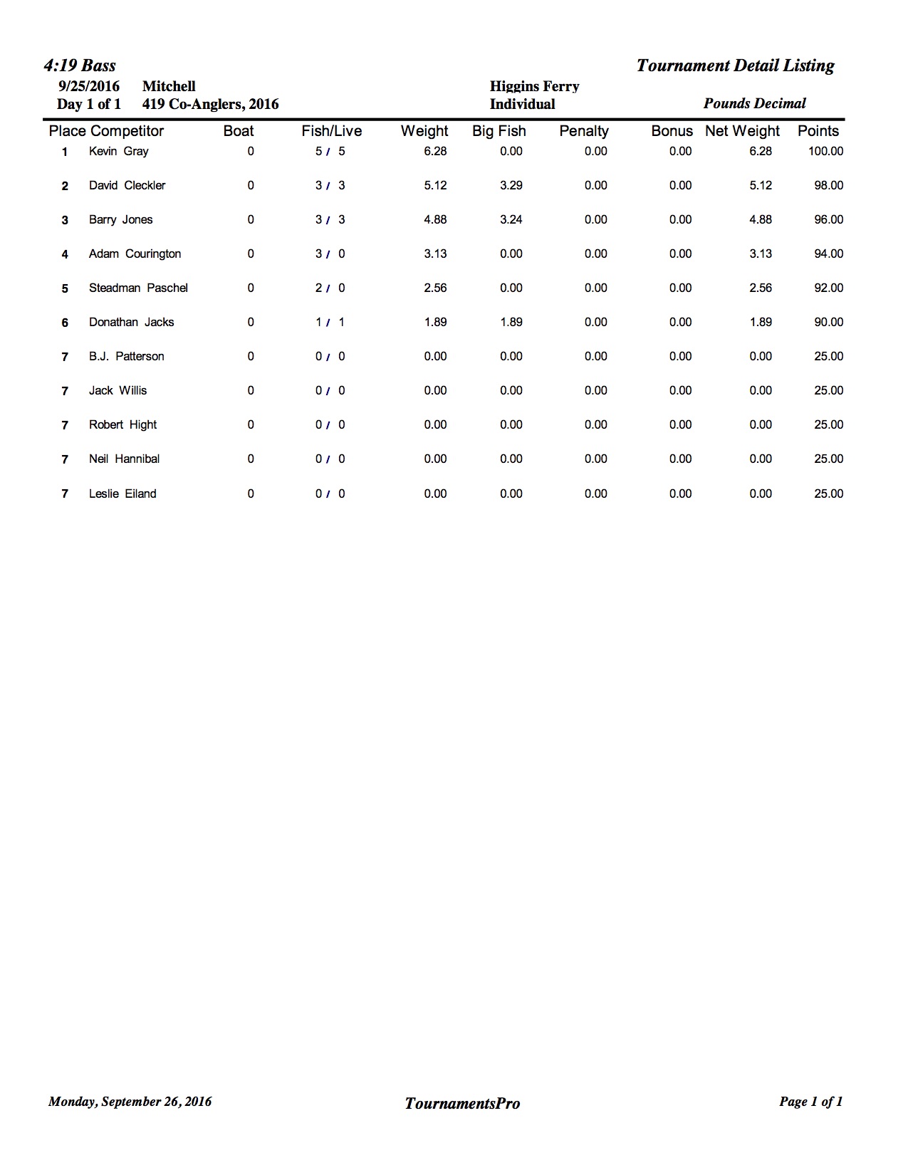 9/25/16 Mitchell Higgins Ferry 2:00 PM Boaters Results Co-Anglers Results