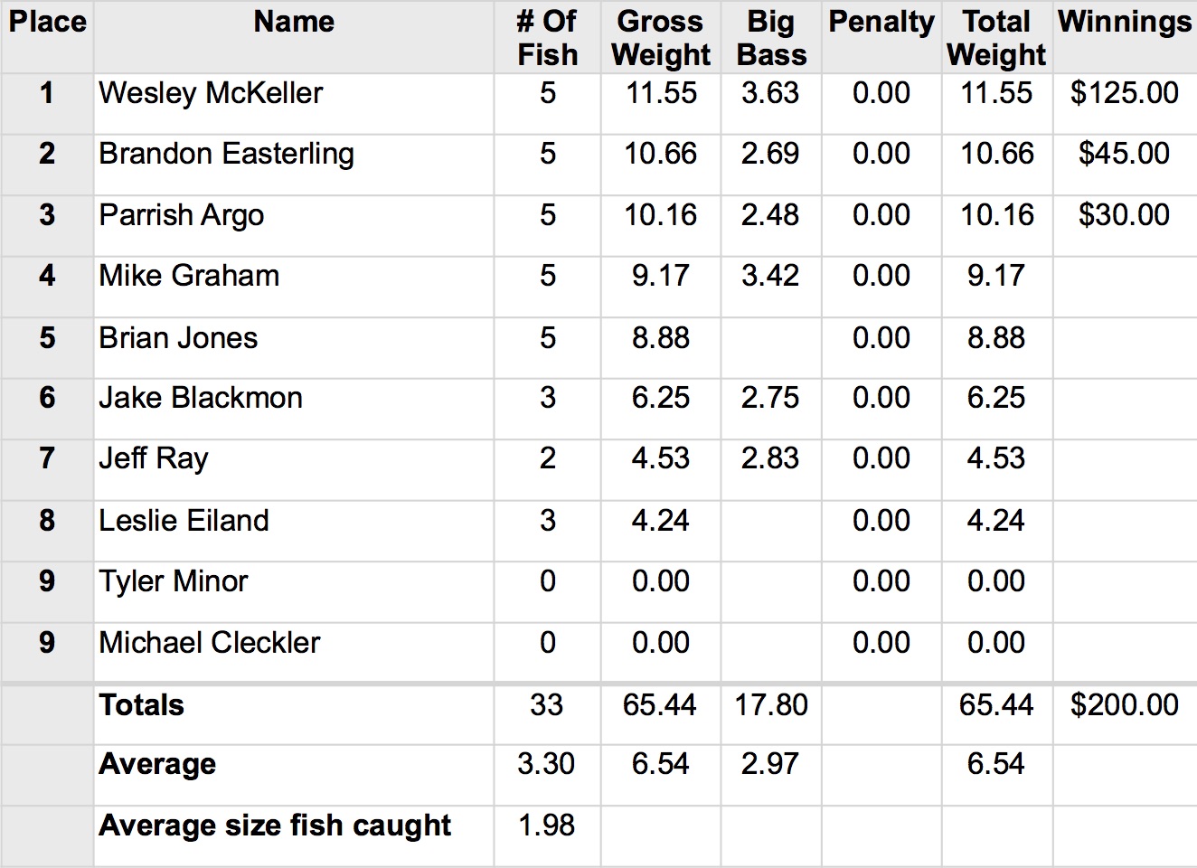 4/9/16 Lay Flatlands Safe Daylight Boaters Results Co-Anglers Results