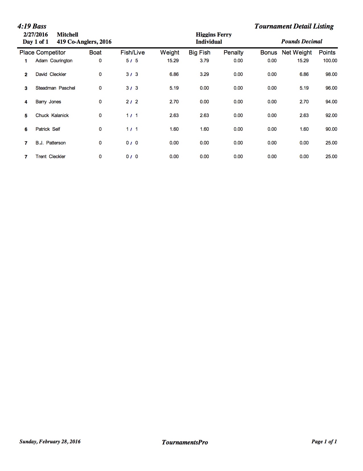 2/27/16 Mitchell Higgins Ferry Safe Daylight Boaters Results Co-Anglers Results