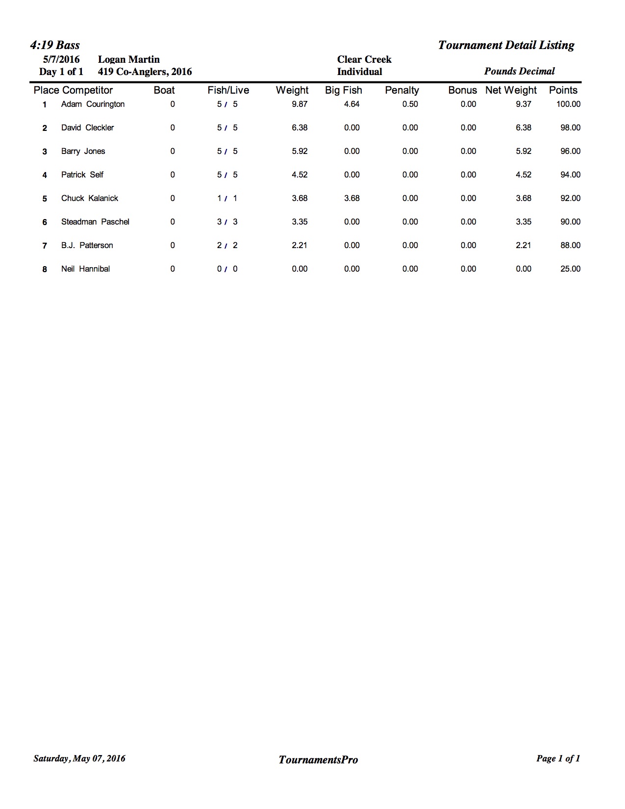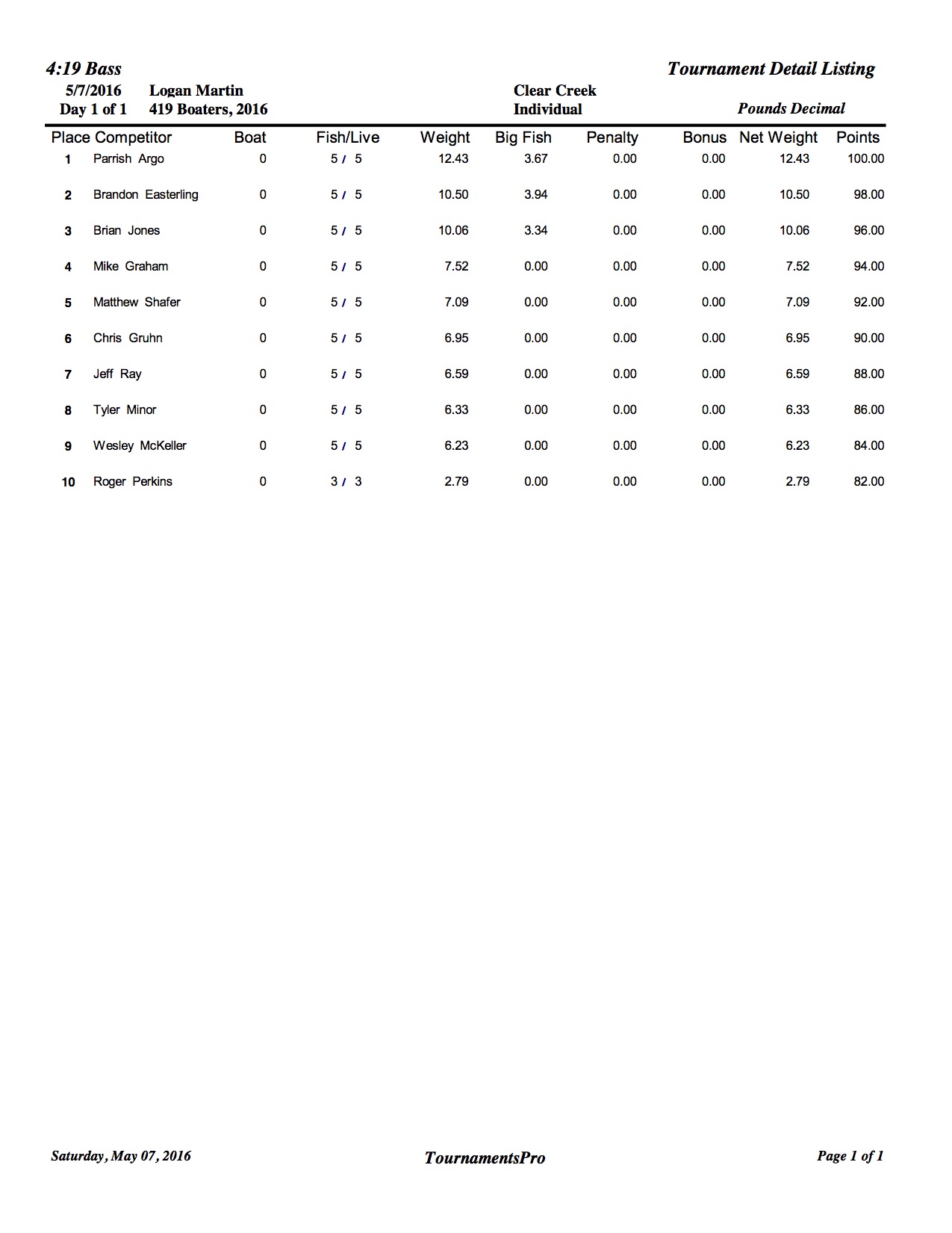 5/7/16 Logan Martin Clear Creek Safe Daylight Boaters Results Co-Anglers Results