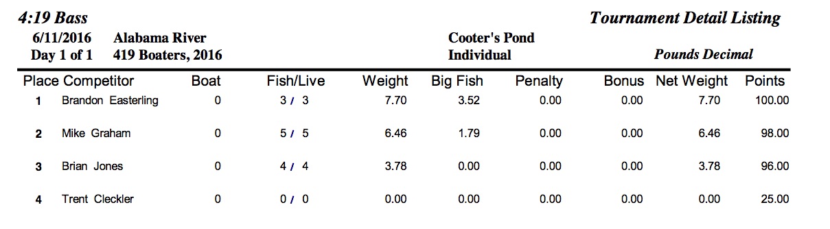 6/11/16 Alabama River Cooter's Pond Safe Daylight Boaters Results Co-Anglers Results