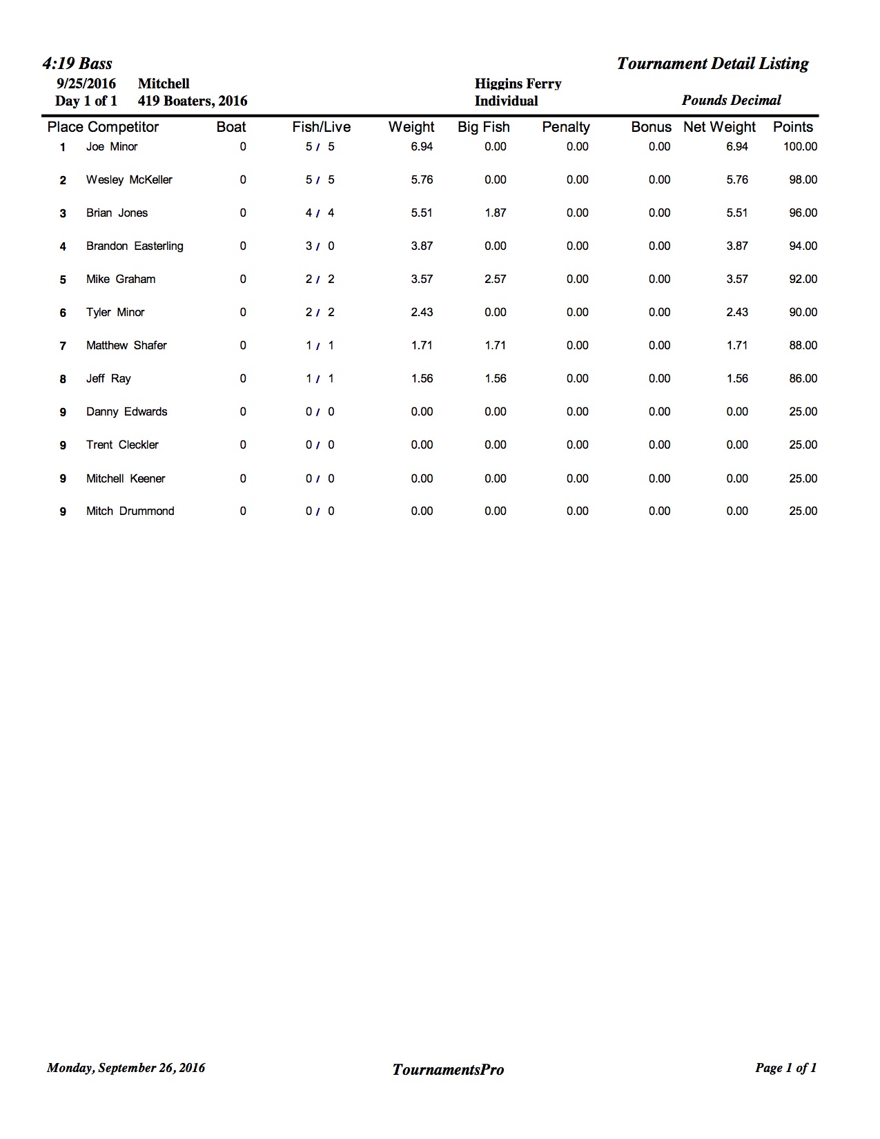 9/25/16 Mitchell Higgins Ferry 2:00 PM Boaters Results Co-Anglers Results