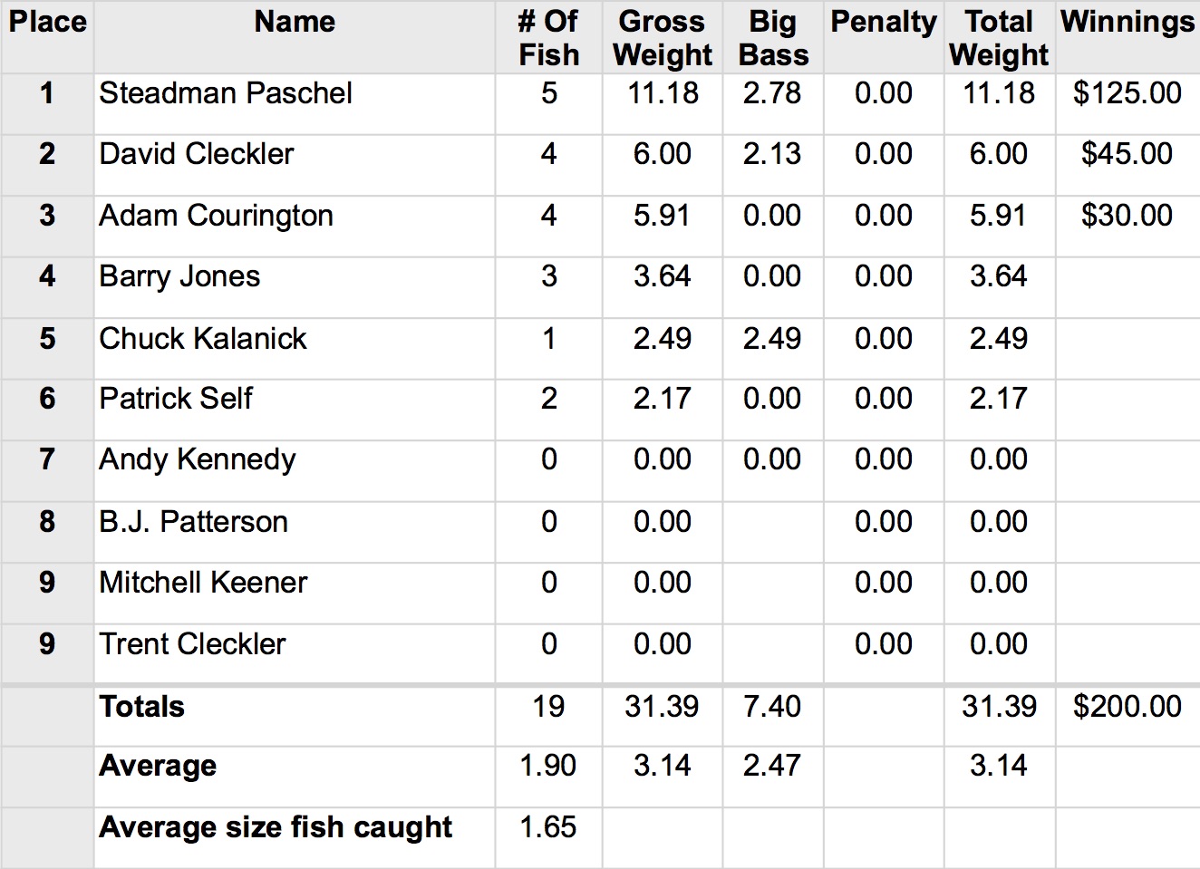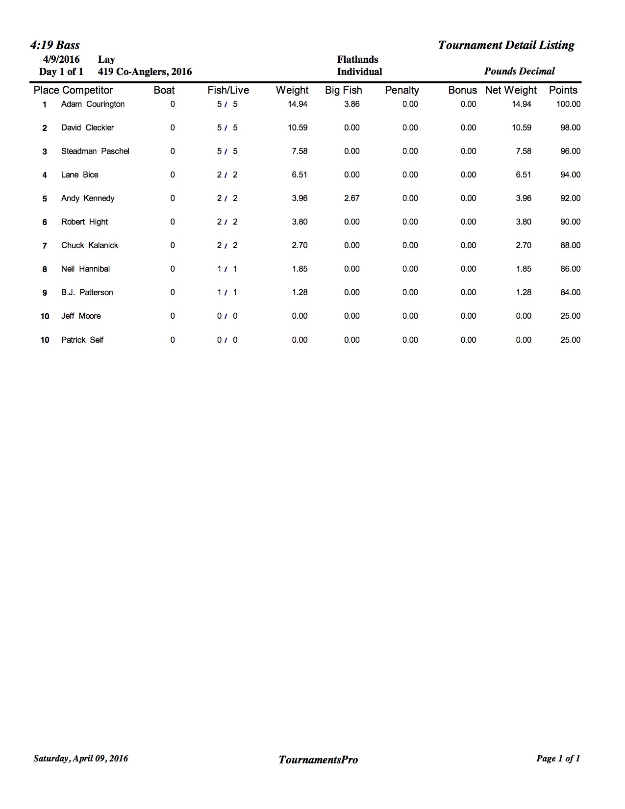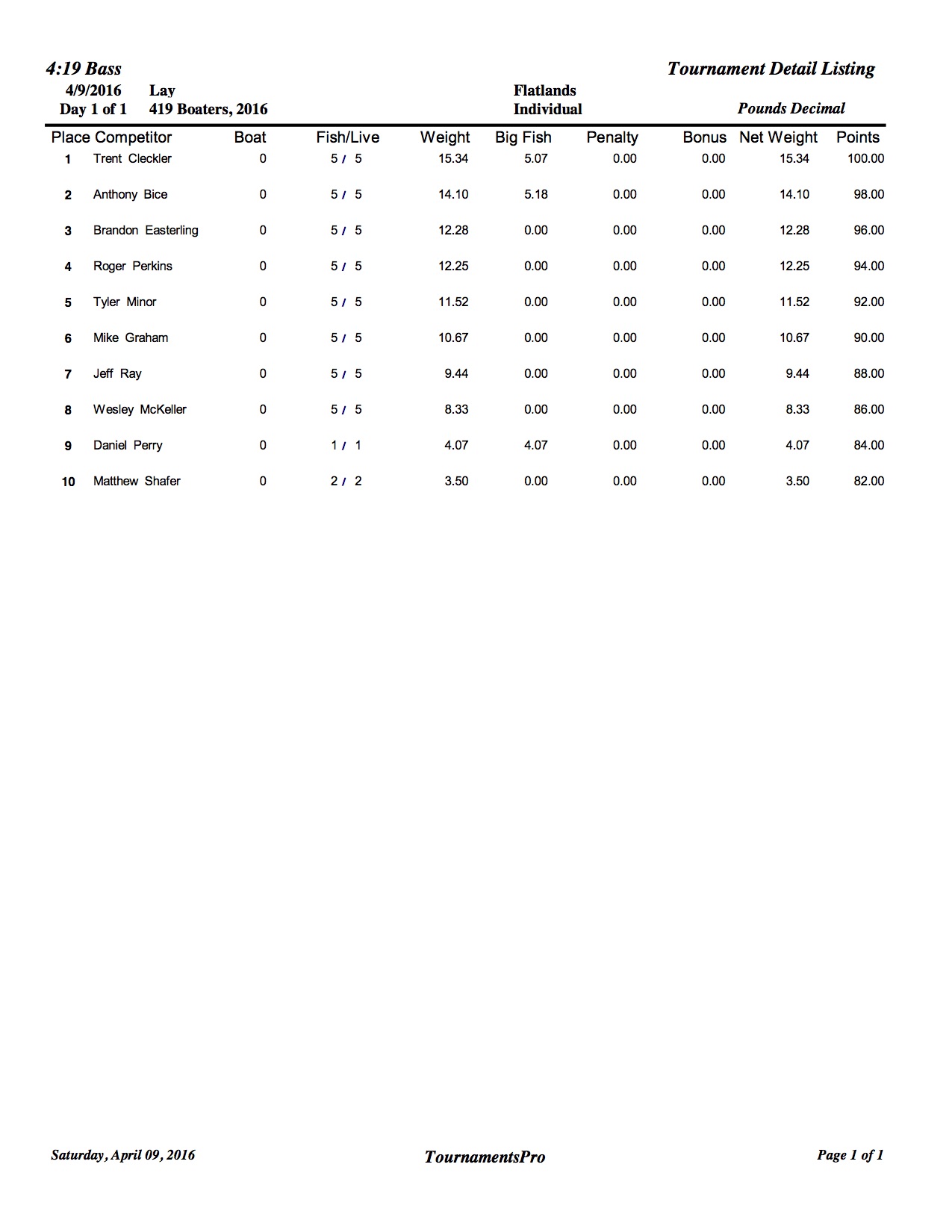 4/9/16 Lay Flatlands Safe Daylight Boaters Results Co-Anglers Results