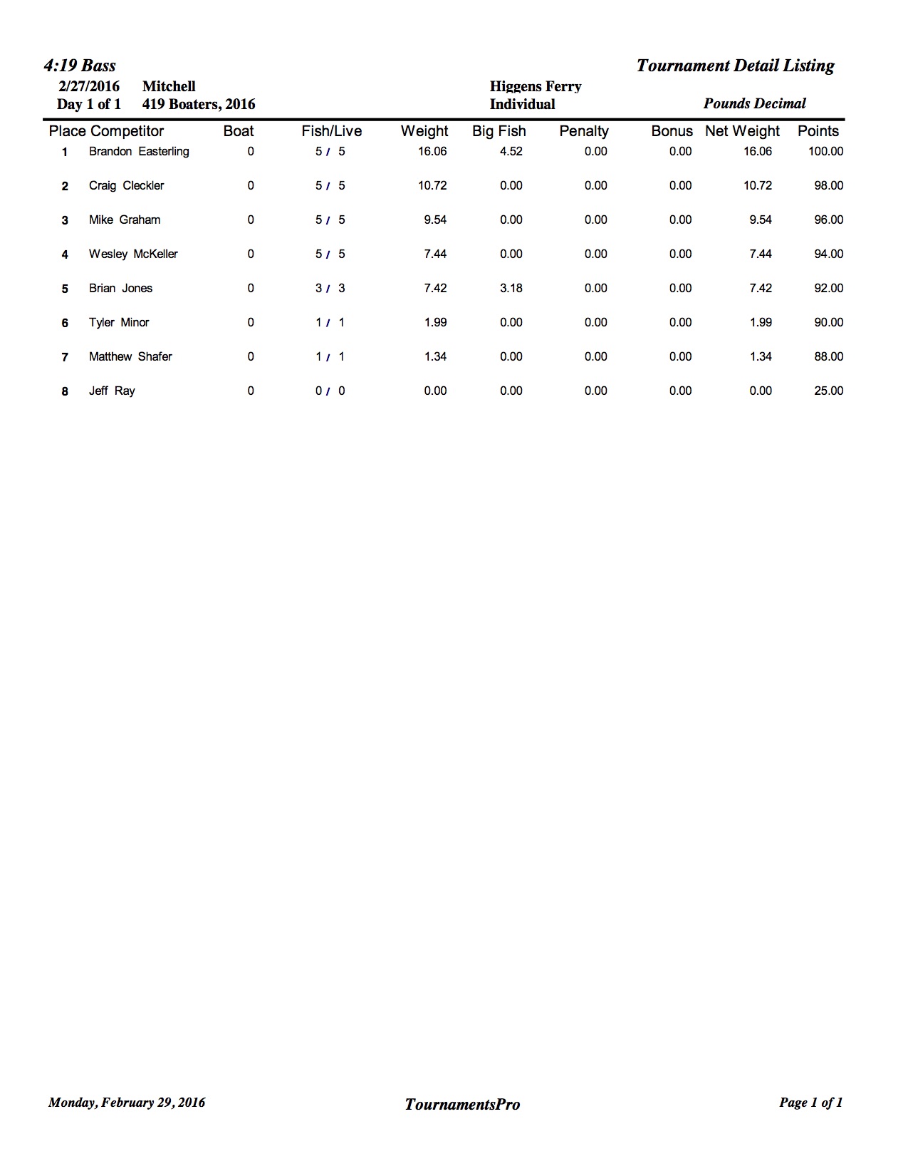 2/27/16 Mitchell Higgins Ferry Safe Daylight Boaters Results Co-Anglers Results
